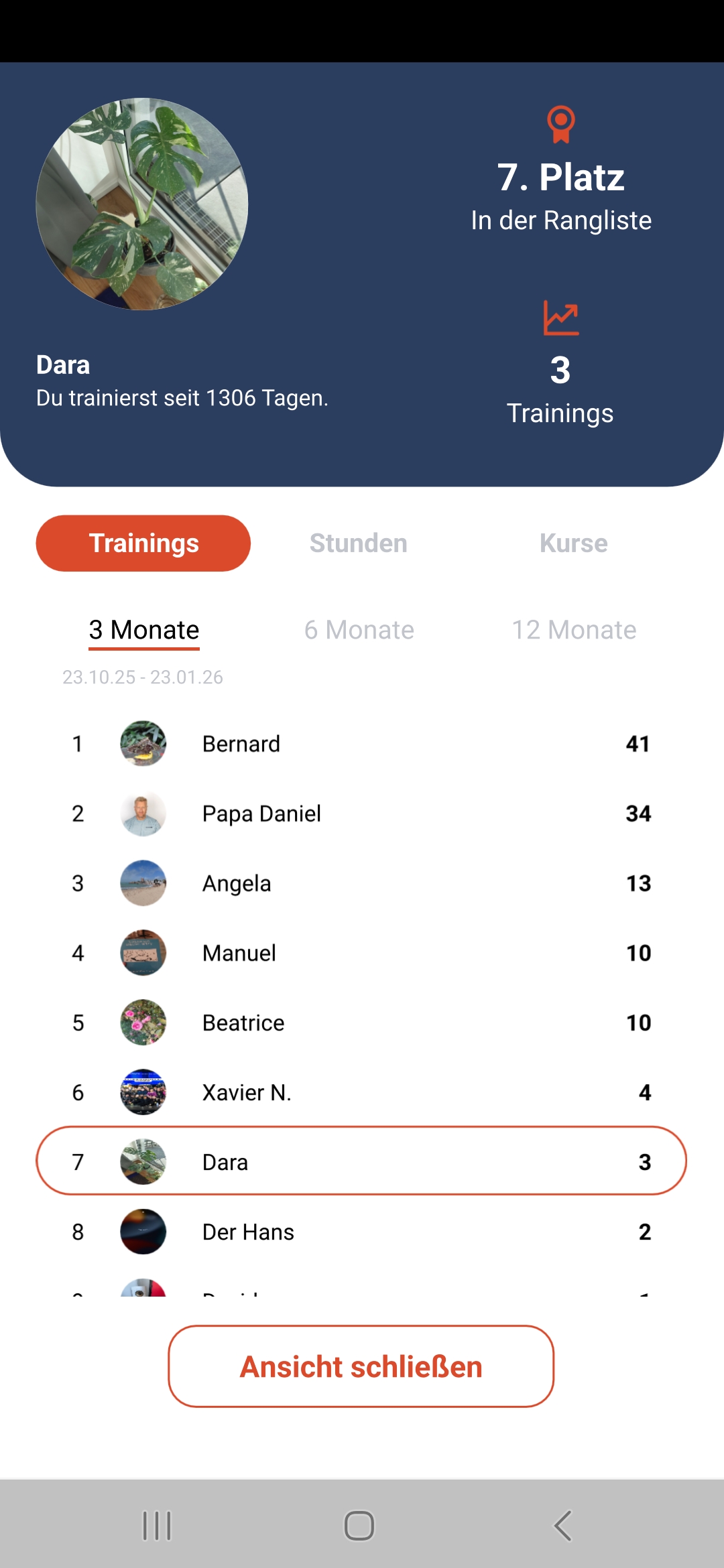 Unten werden zudem durchschnittliche Check-Ins pro Monat und die durchschnittliche Trainingszeit angezeigt.