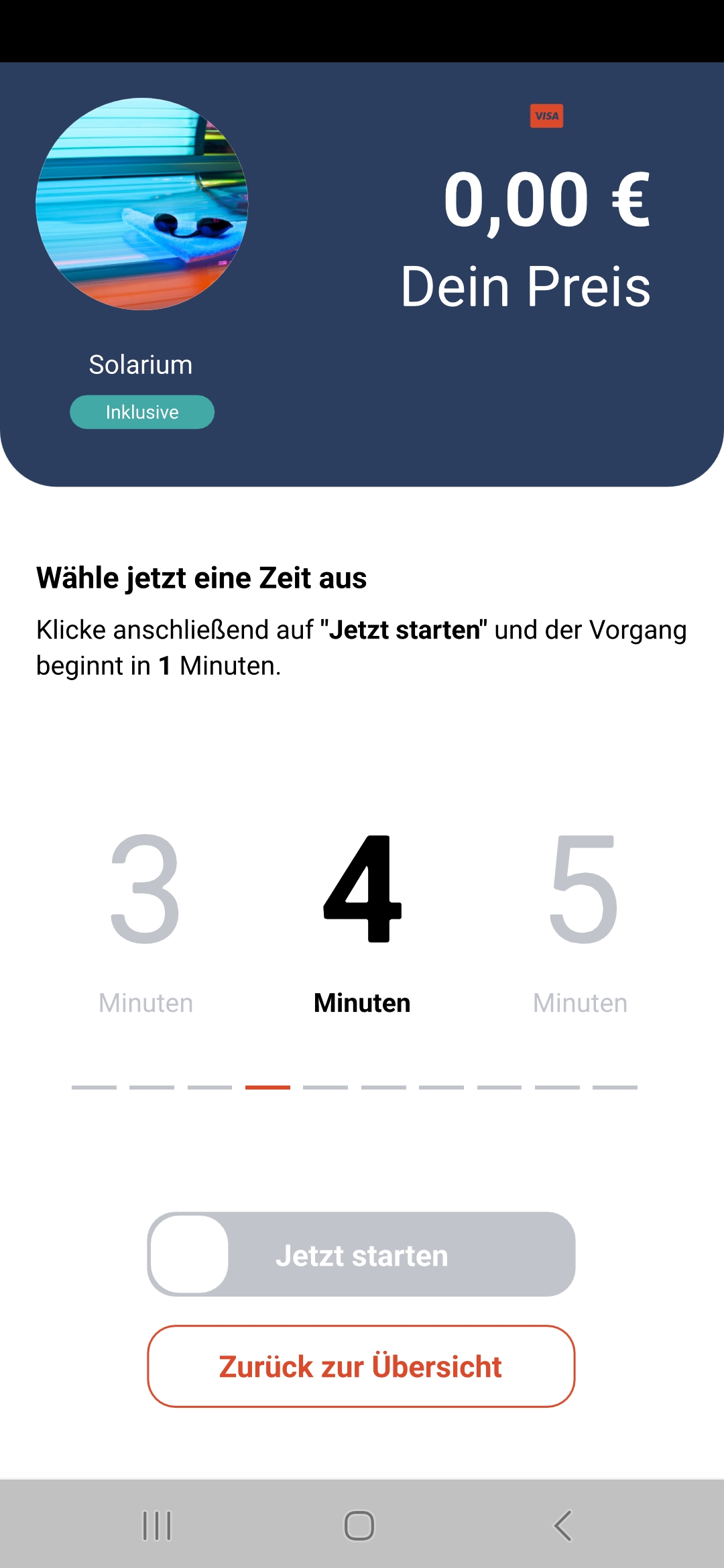 Folgend ist die Ansteuerung des Solariums gezeigt. Die Zahl gewünschter Minuten kann ausgewählt werden und wenn das Solarium erfolgreich gestartet werden kann, wird eine Anzeige zum Ablauf der Vorlaufzeit angezeigt und nach Ablauf eine Anzeige der verbleibenden Nutzdauer. Die Nachlaufzeit wird in der App nicht angezeigt, aber das Gerät kann während dieser nicht gebucht werden.