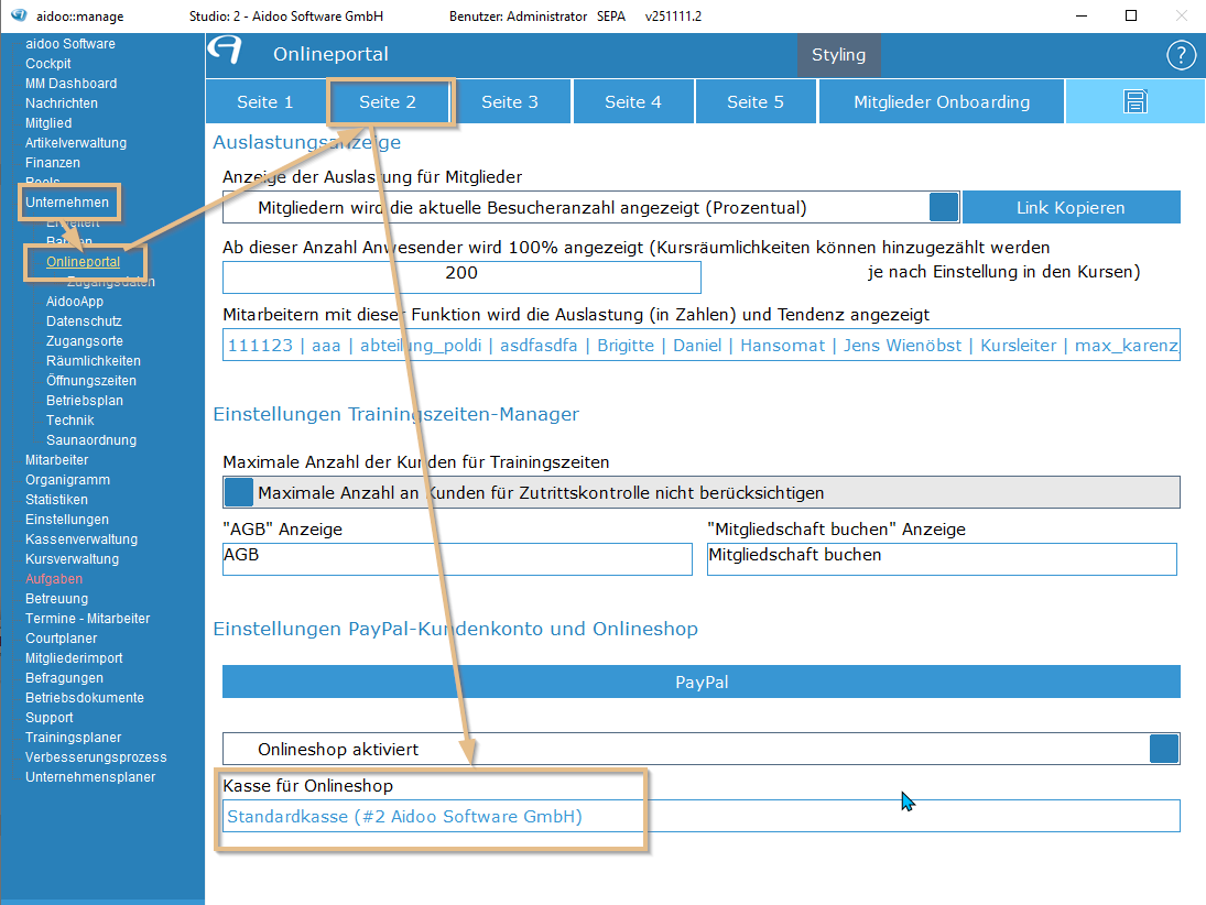 Für alle Buchungen in der App (z.B. Guthaben) muss eine Kasse hinterlegt werden. Die Kasse kann in der aidoo Manage unter Unternehmen → Onlineportal → Seite 2 → Einstellungen PayPal-Kundenkonto und Onlineshop festgelegt werden.