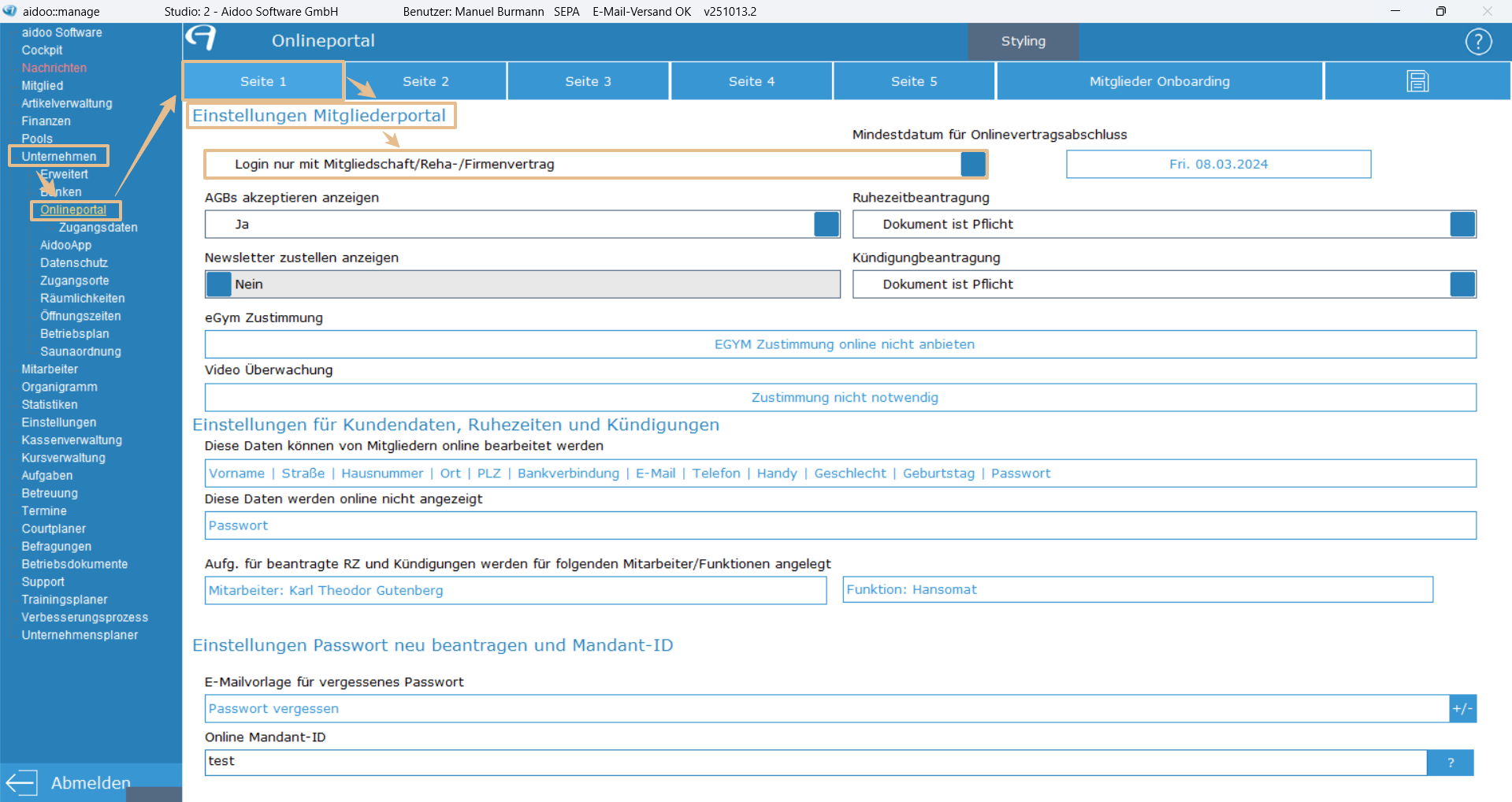 In älteren Versionen der DeinSport App war auch ein Login ohne Vertrag möglich. Dies kann unterbunden werden, indem der Login nur mit Vertrag aktiviert wird Login nur mit Mitgliedschaft/Reha-/Firmenvertrag. Die Einstellung ist zu finden unter Unternehmen → Onlineportal → Seite 1 → Einstellungen Mitgliederportal.